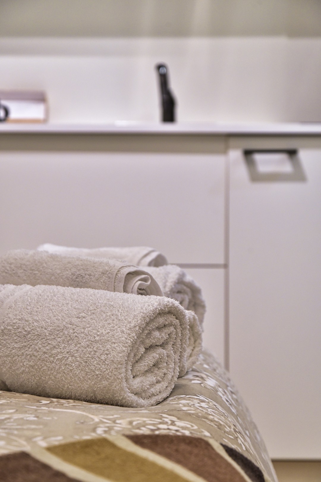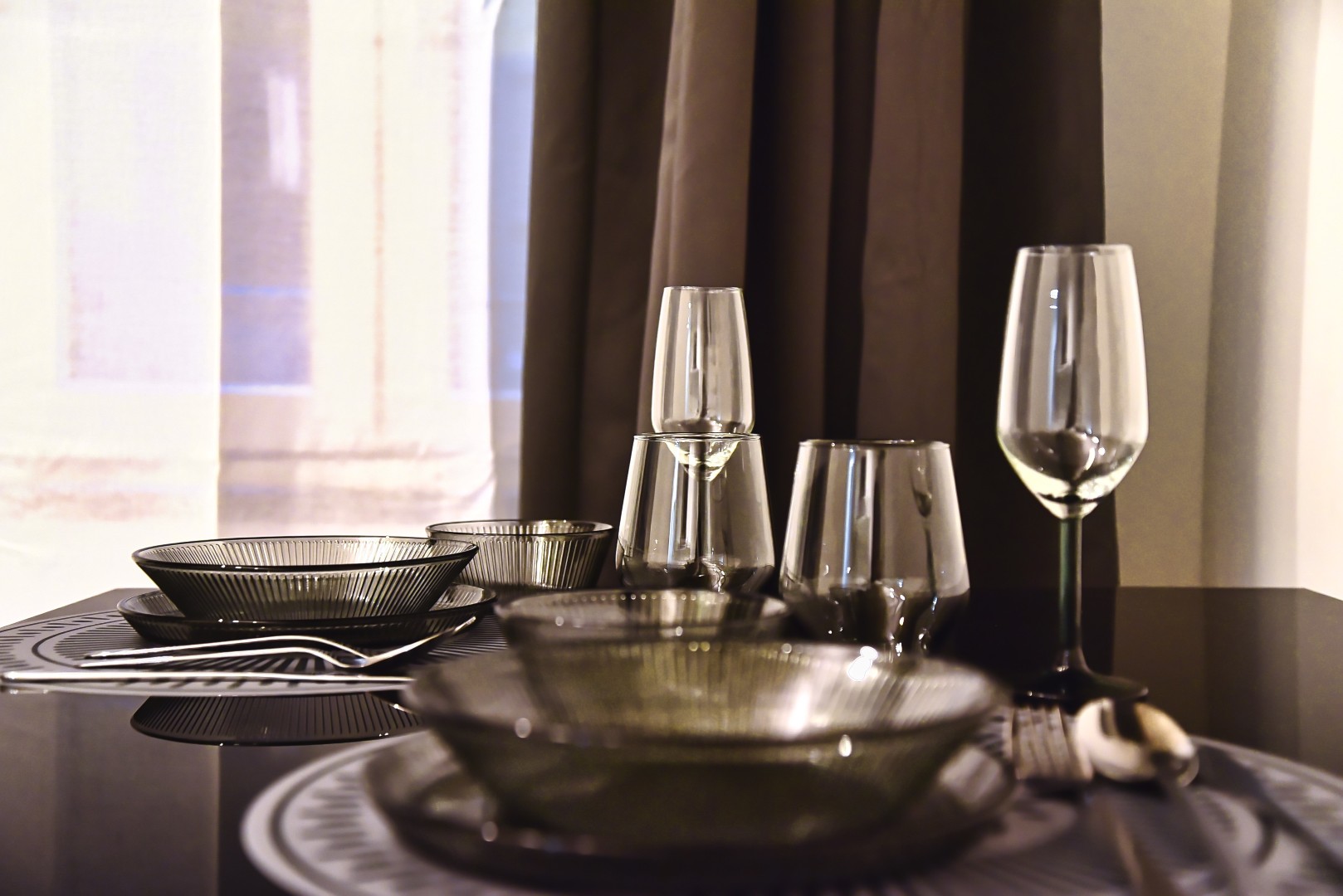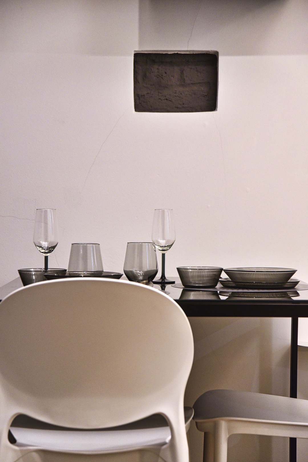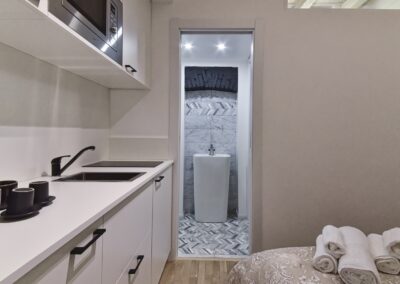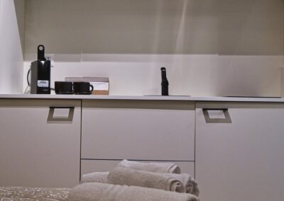 La cucina, compatta ma completa, è dotata di piano cottura a induzione, frigorifero, microonde, bollitore elettrico e macchina da caffè. Tutto l’occorrente per preparare un pasto semplice in autonomia è a disposizione degli ospiti, inclusi stoviglie e utensili da cucina.