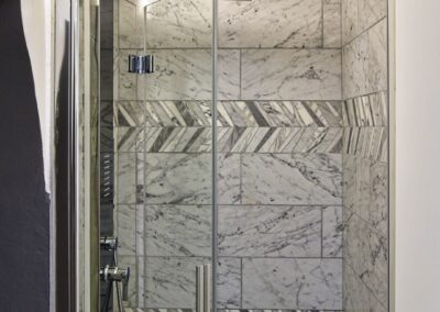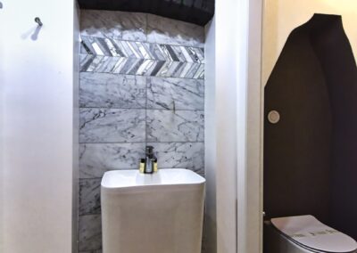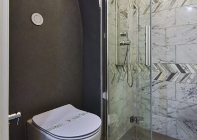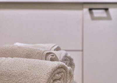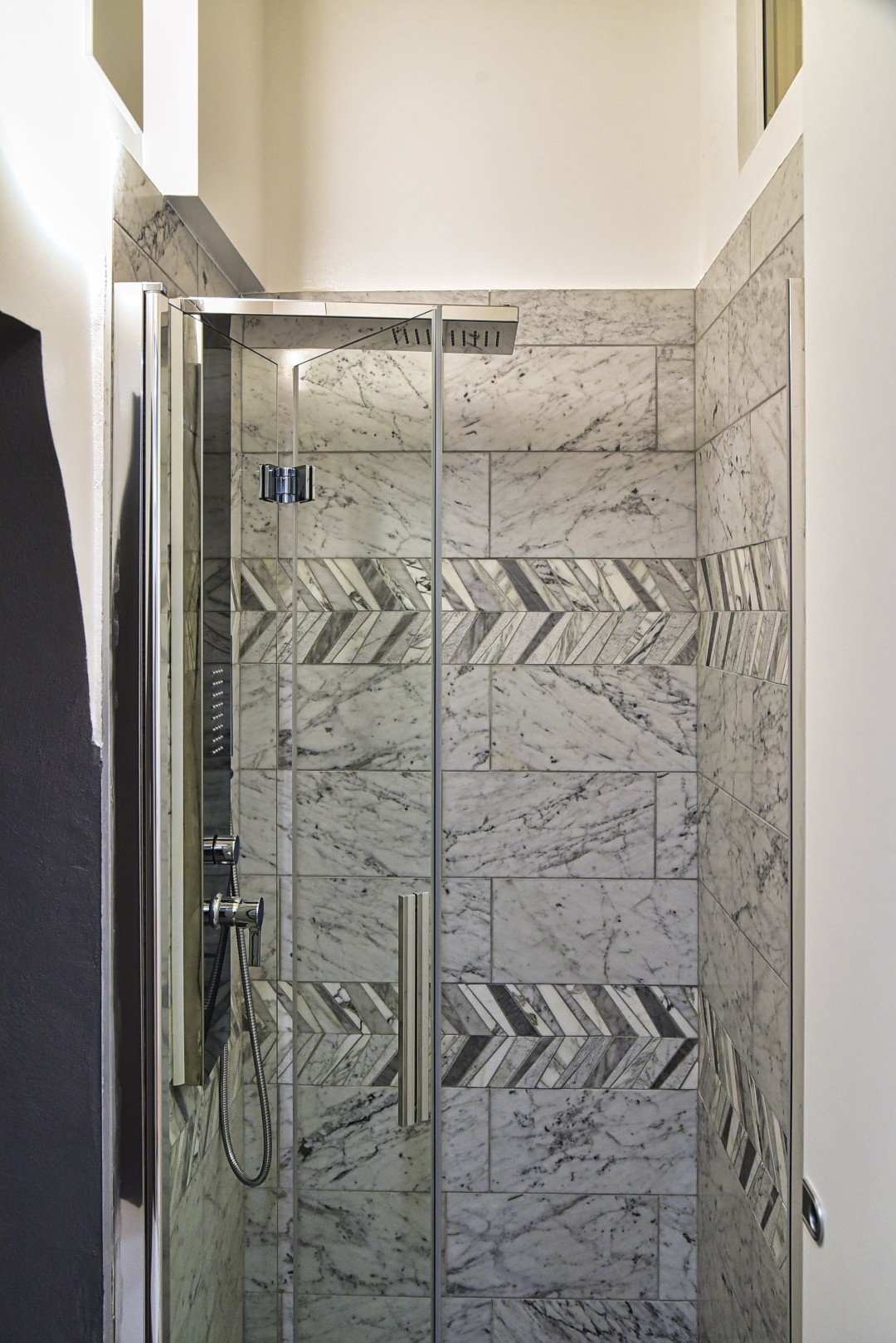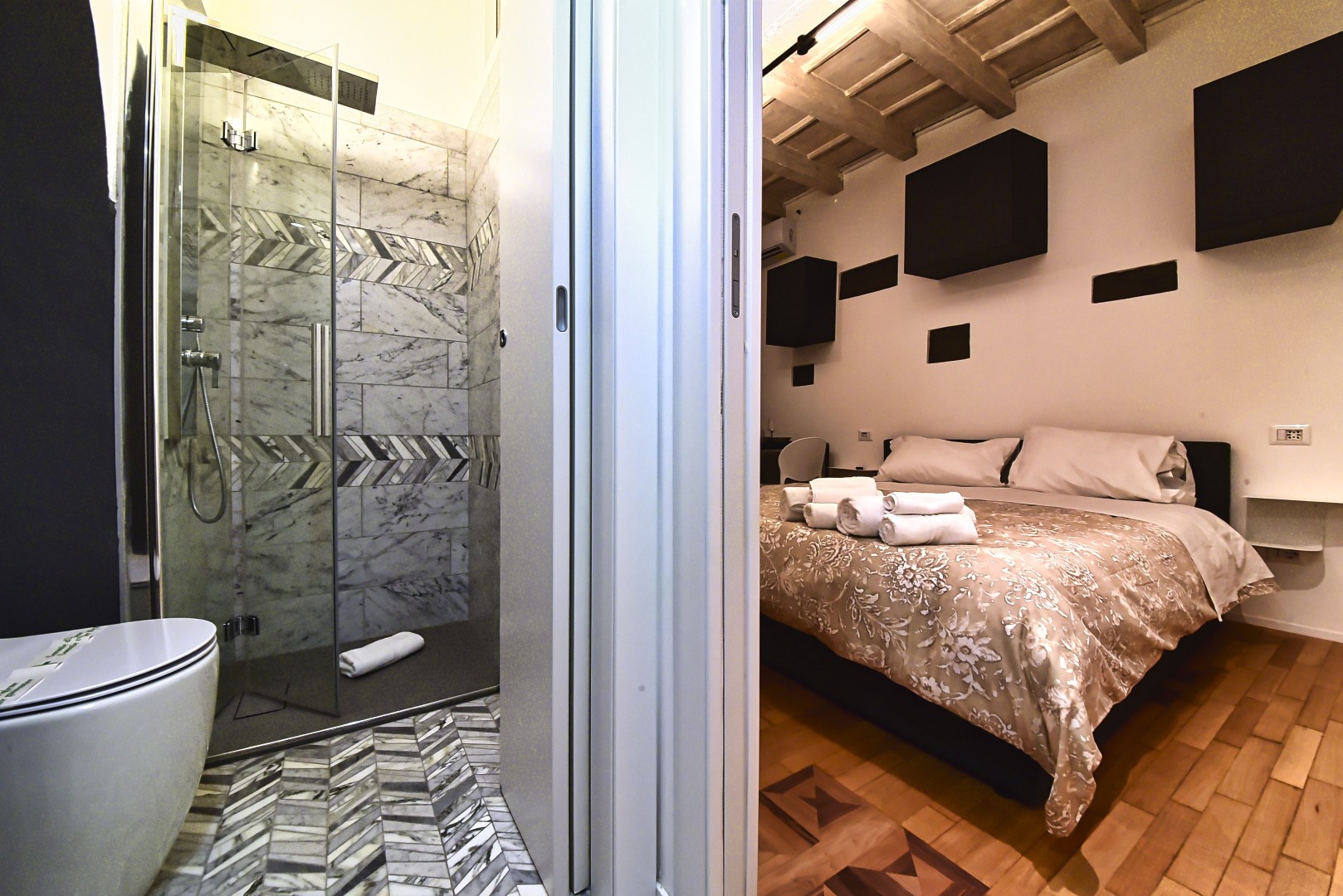 Il bagno privato è moderno e luminoso, dotato di doccia walk-in, asciugacapelli e set di cortesia. A disposizione degli ospiti anche asciugamani, accappatoi e prodotti da bagno per garantire il massimo comfort.