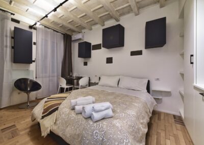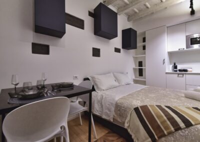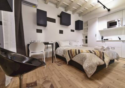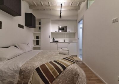 Il monolocale è stato progettato per ottimizzare ogni centimetro, offrendo un ambiente raccolto ma estremamente funzionale. Il soggiorno è arredato con un letto matrimoniale comodo e una piccola zona pranzo per due persone, ideale per colazioni o cene veloci. Le ampie finestre donano luce naturale durante tutto il giorno, creando un’atmosfera calda e accogliente.