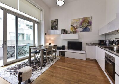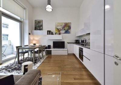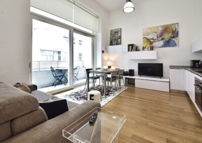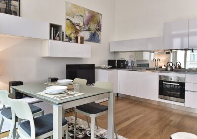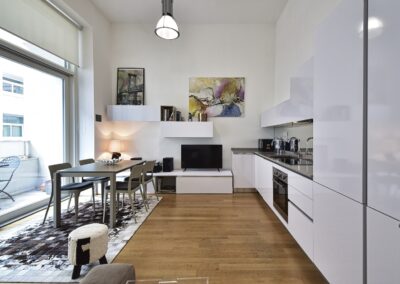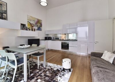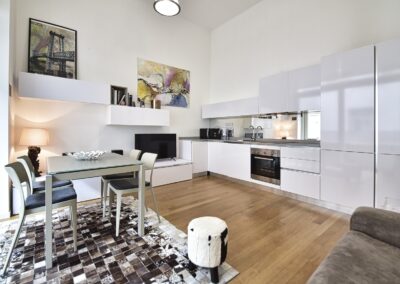 La Suite Navigli, con i suoi ambienti generosi e ben distribuiti, è pensata per accogliere comodamente gruppi, famiglie o ospiti che necessitano di spazi distinti durante il soggiorno. Gli interni sono arredati in stile moderno, con linee pulite e materiali scelti per garantire comfort, funzionalità e una sensazione di accoglienza immediata. Ogni ambiente è valorizzato da luce naturale e da una disposizione degli spazi che favorisce sia momenti di convivialità che piena privacy.